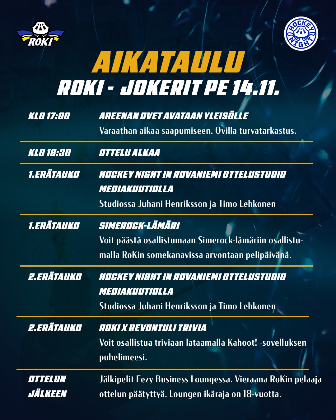Tapahtumainfot ja aikataulut pe 14.11. RoKi – Jokerit otteluun
