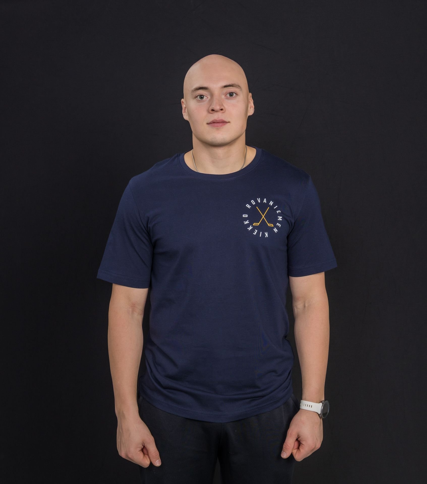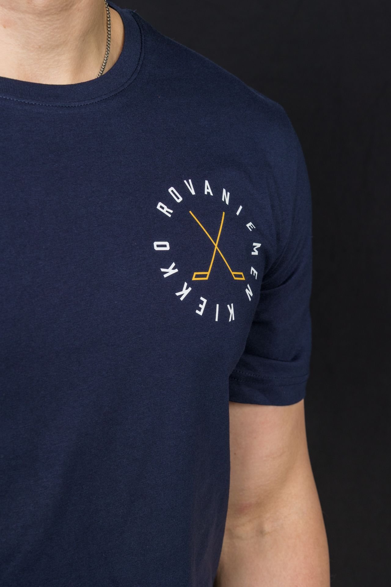 RoKi unisex t-paita jossa edessä pieni Rovaniemen Kiekko painatus, takana iso painatus.
