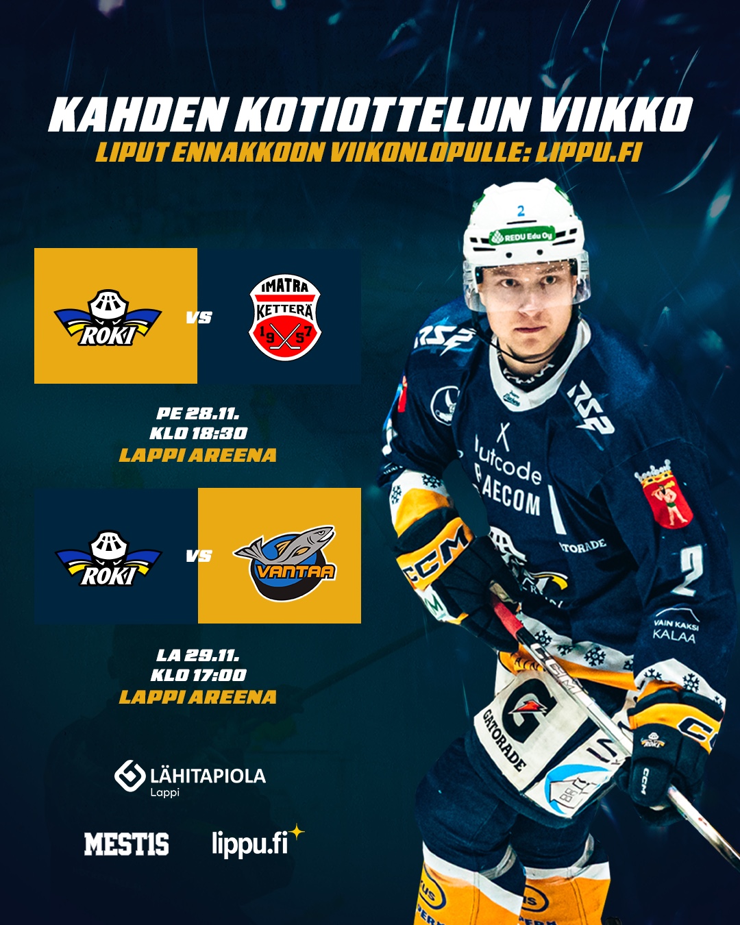 Perjantaina 28.11.2025 RoKi – Ketterä klo 18:30 Perjantain otteluisäntänä: Lähitapiola Lappi Ottelutapahtuman ovet avautuvat klo 17:30.