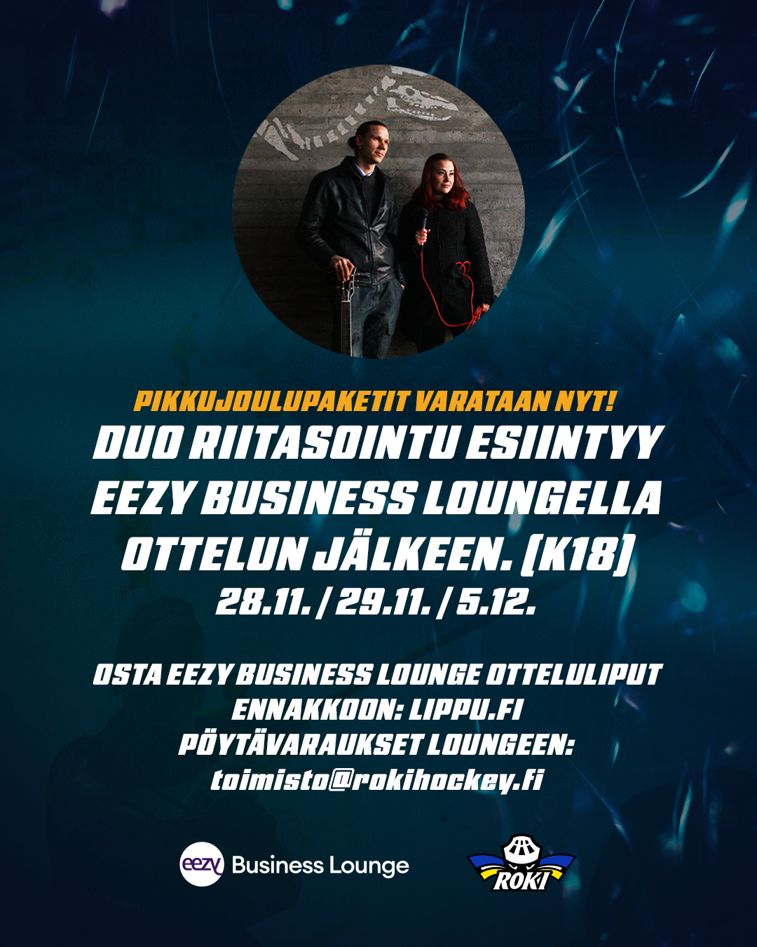 Pikkujoulukauden kunniaksi RoKin tulevissa kotiotteluissa Eezy Business Loungen asiakkaita viihdyttää otteluiden jälkeen livemusiikillaan Duo Riitasointu...